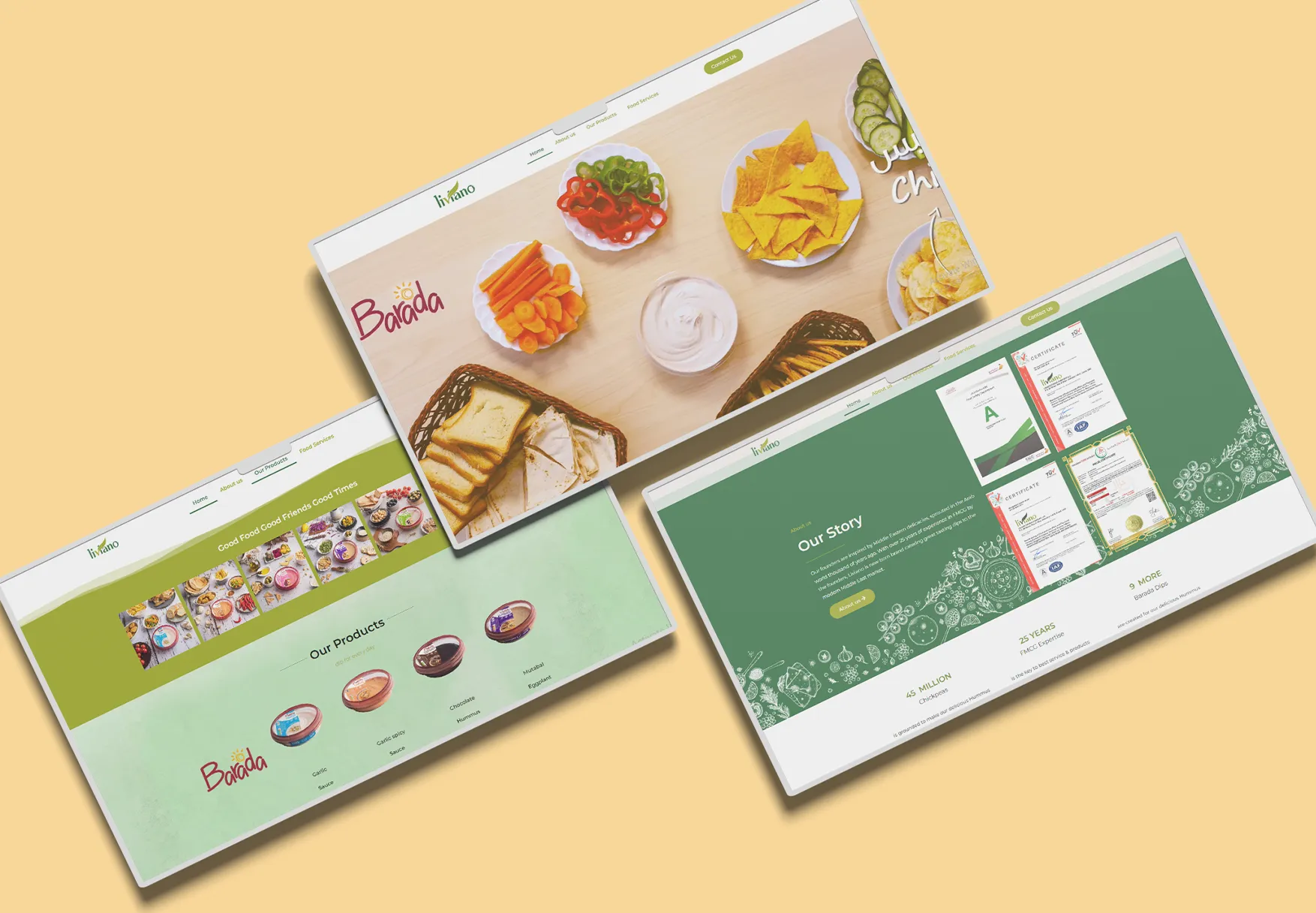 Created the brand identity, logo, and packaging design for hummus, dips, and snacks under Liviano Foods. Developed the company website and managed their social media presence